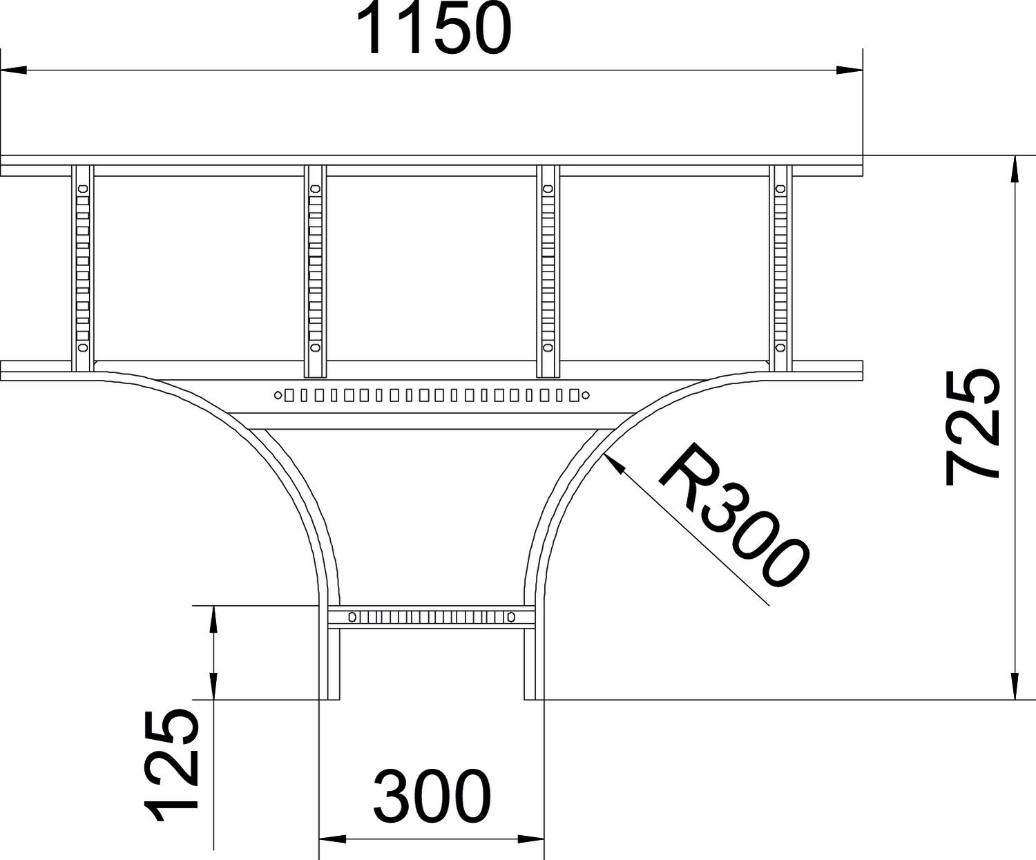 Descrição do produtoDerivação em T, horizontal, com degraus soldados para todos os caminhos de cabos tipo escada com uma altura lateral de 110 mm.