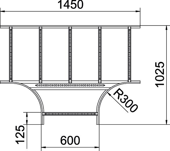 Descrição do produtoDerivação em T, horizontal, com degraus soldados para todos os caminhos de cabos tipo escada com uma altura lateral de 110 mm.